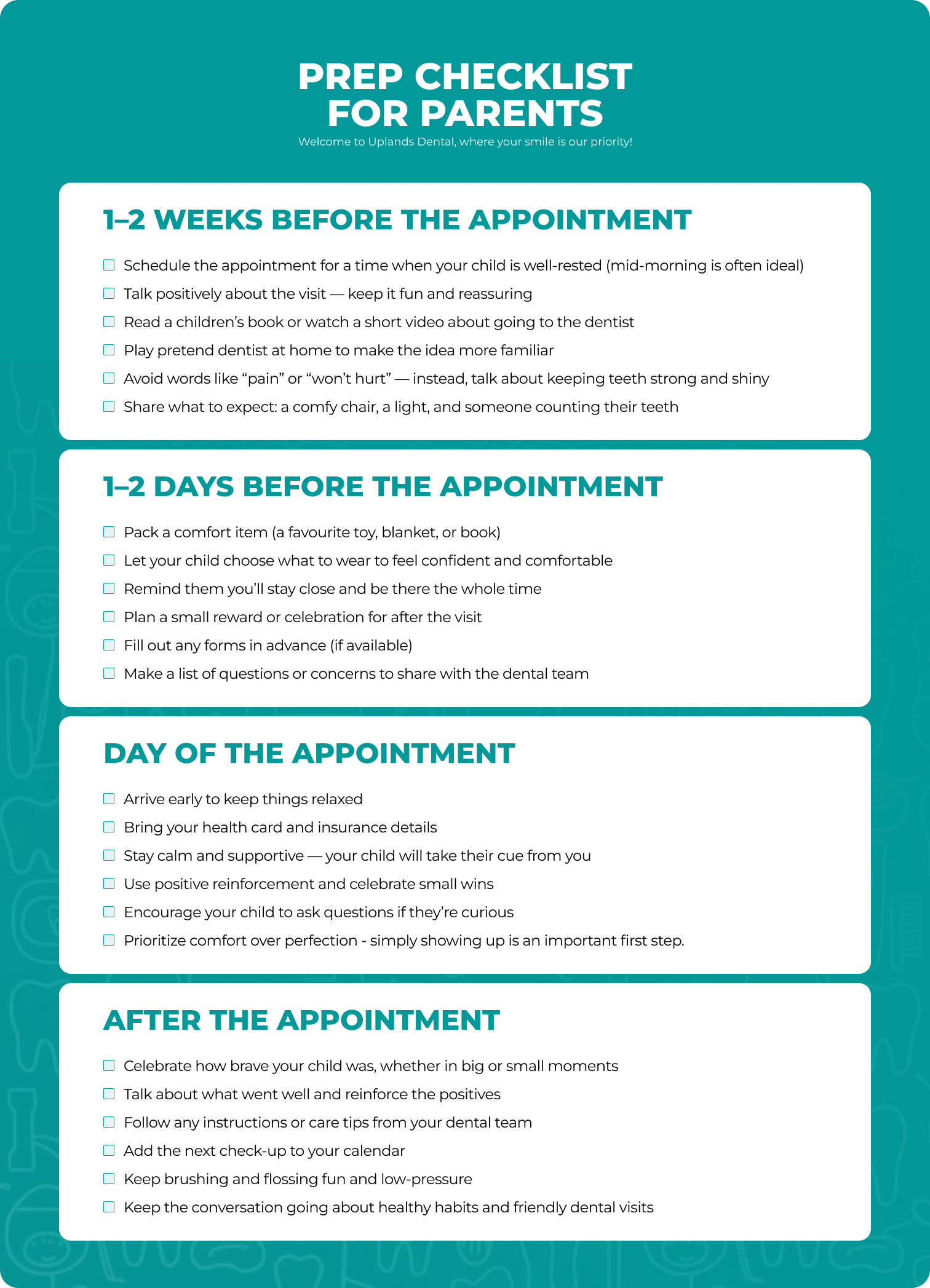 One of the best things you can do to prepare is to talk about the visit well in advance. We recommend scheduling a child’s first dental appointment within six months of their first tooth coming in, or by age one, as recommended by the Canadian Dental Association.