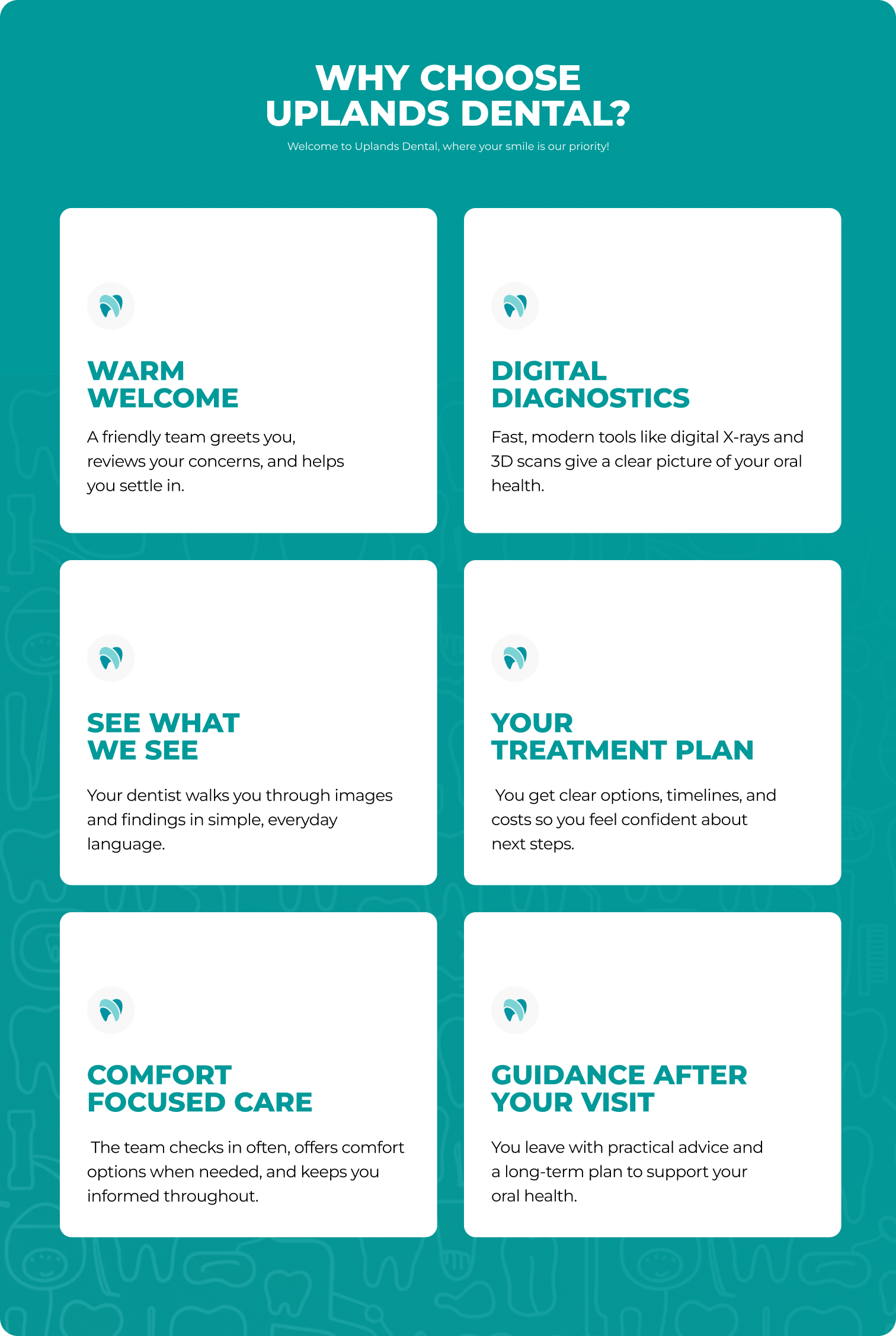 When you visit Uplands Dental, you’re never just a name on a chart. We take the time to get to know each of our patients—your goals, concerns, preferences, and even your family. That personal connection allows us to provide care that fits your life and puts you at ease from the moment you walk through our doors.